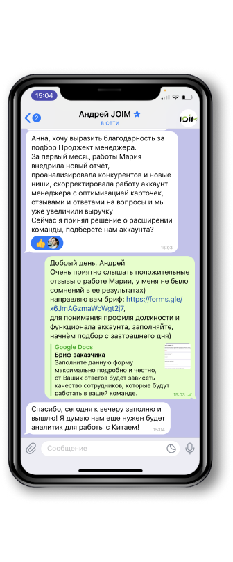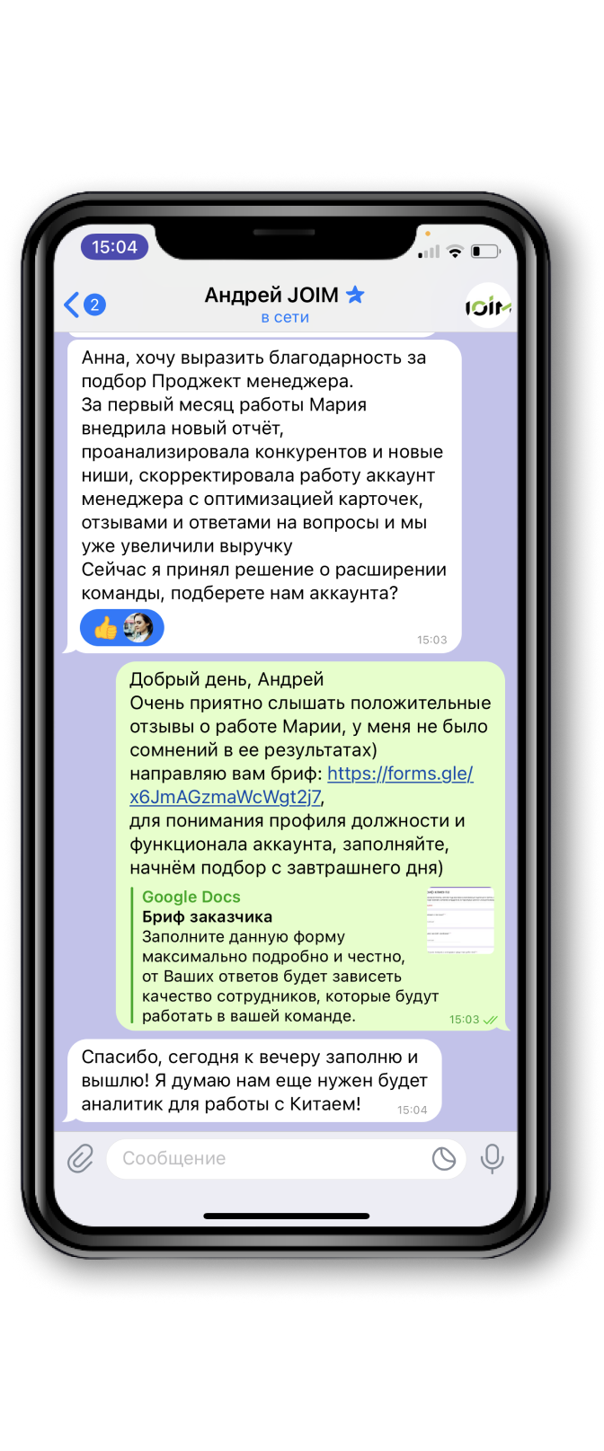 C вами свяжется наш HR специалист и проведет брифинг чтобы погрузиться в вашу ситуацию, понять целевой запрос, уточнить детали и нюансы, а также ваши пожелания к кандидатам (например: с каким МП предстоит работать, на какой вид работ нужно сделать акцент (поставки, поиск поставщиков, аналитика, SEO-оптимизация или нужен универсал).